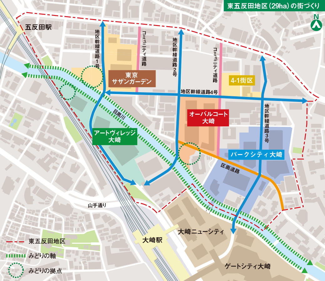 そして、「大崎エリアマネージメント EASTオフィス」(旧大崎・五反田タウンマネージメント)が当面対象とする、JR山手線「五反田」駅と「大崎」駅にまたがる「東五反田地区」においては、5街区を中心としたまちづくりが進展しています。平成13年7月には、リーディングプロジェクトである「オーバルコート大崎」が完成し、平成19年1月には「アートヴィレッジ大崎」が完成、引き続き平成22年7月には「東京サザンガーデン」が完成。そして、平成27年には「パークシティ大崎」が全体竣工し、緑と賑わいにあふれた潤い豊かな街へと発展しています。